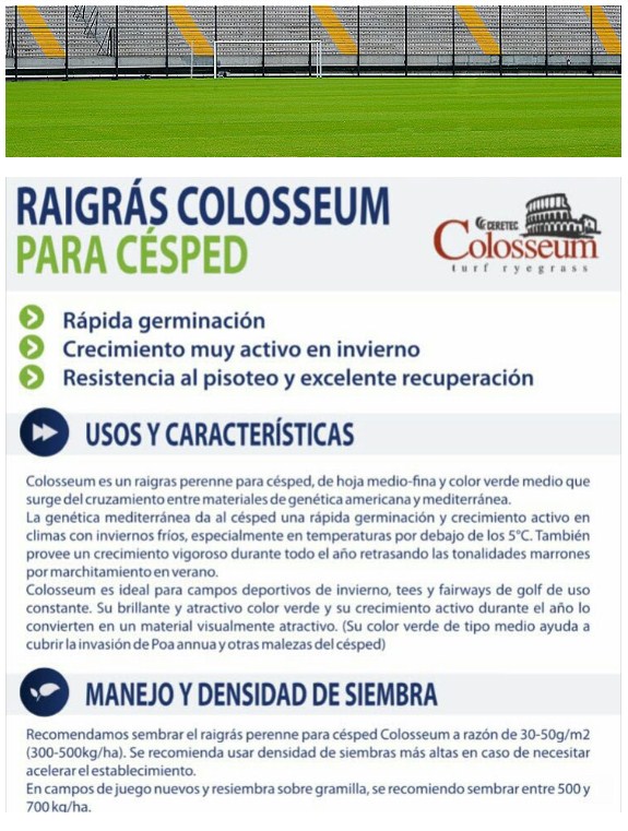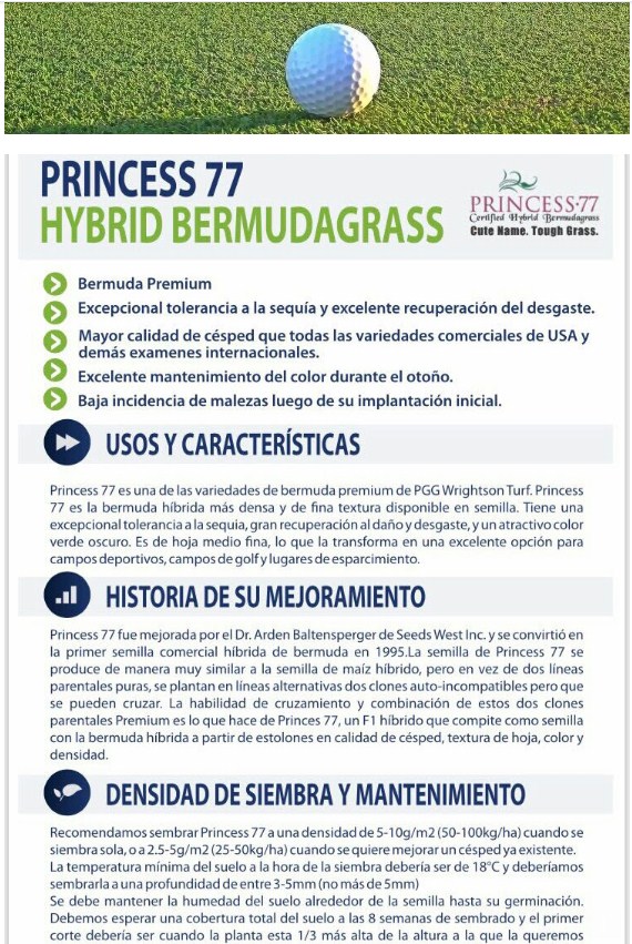 En semillas tenemos Bermuda (Princess 77), y raigrás anual (Approach) y perenne (Colosseum), pudiendo hacer plantaciones puras o mezclas según las necesidades paisajísticas o de uso en caso de canchas deportivas, también contamos con panes de césped de bermuda y axonopus.